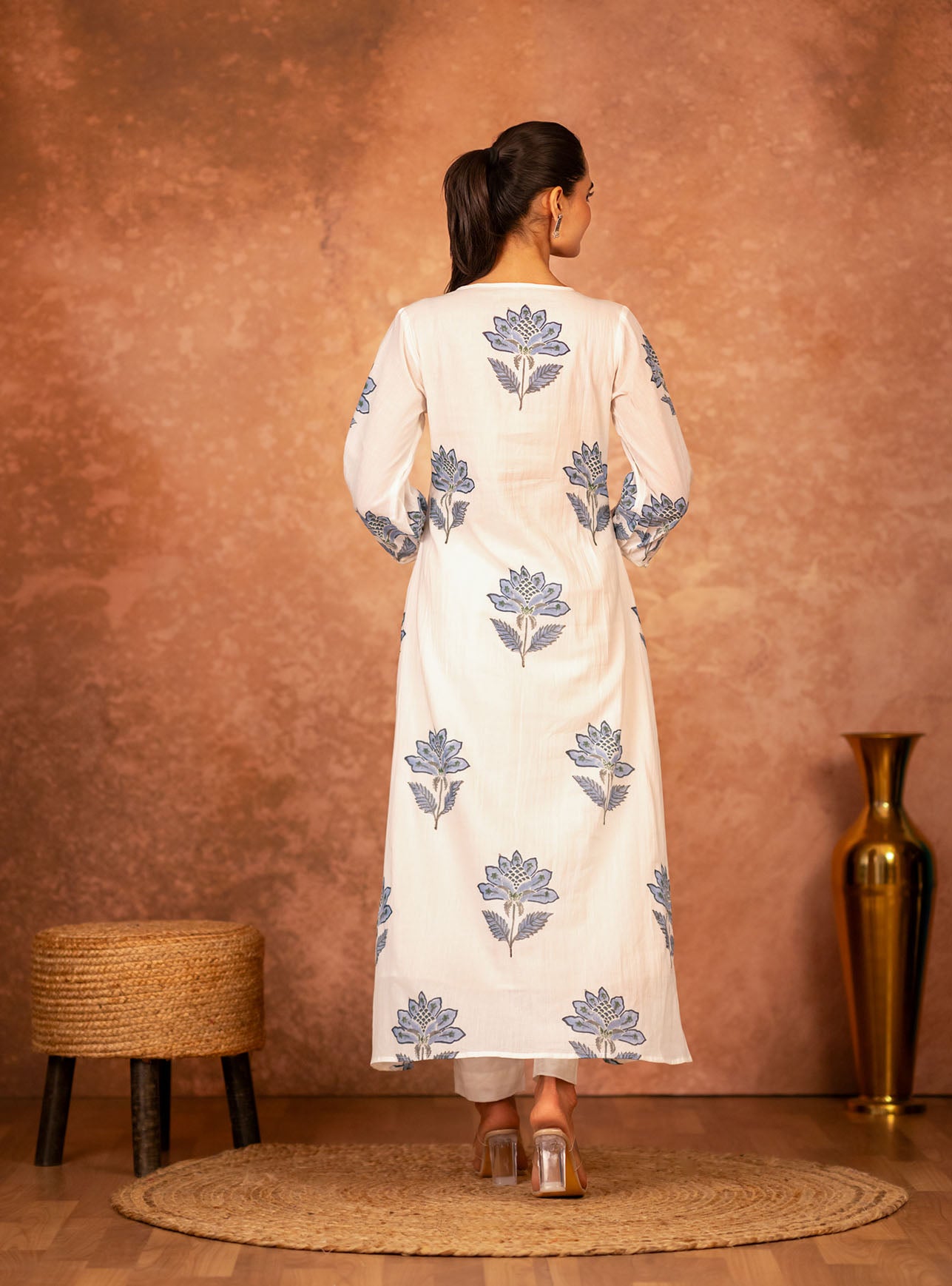 Radiate elegance and comfort with this Off-White Blue Hand Block Printed Kurta Set, crafted from premium cotton fabric. Adorned with intricate blue floral motifs, each print is hand-blocked by skilled artisans, celebrating traditional craftsmanship with a modern touch. The flattering flared silhouette, 3/4th sleeves, and round neckline with tie-up detail make it ideal for festive gatherings, office wear, or casual outings.
