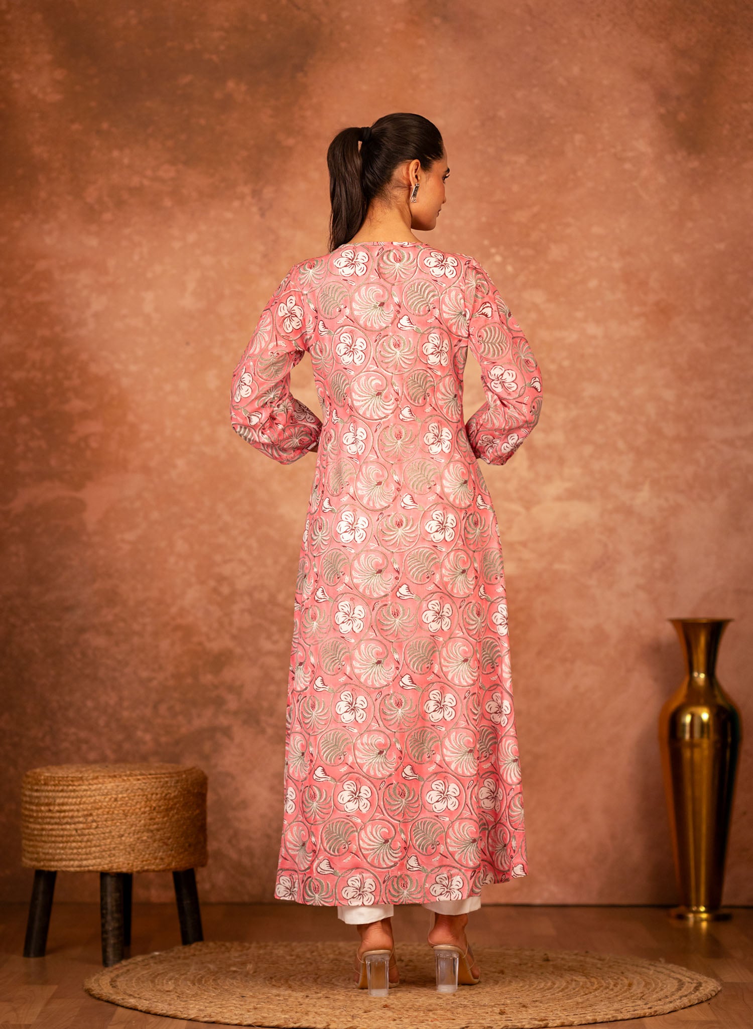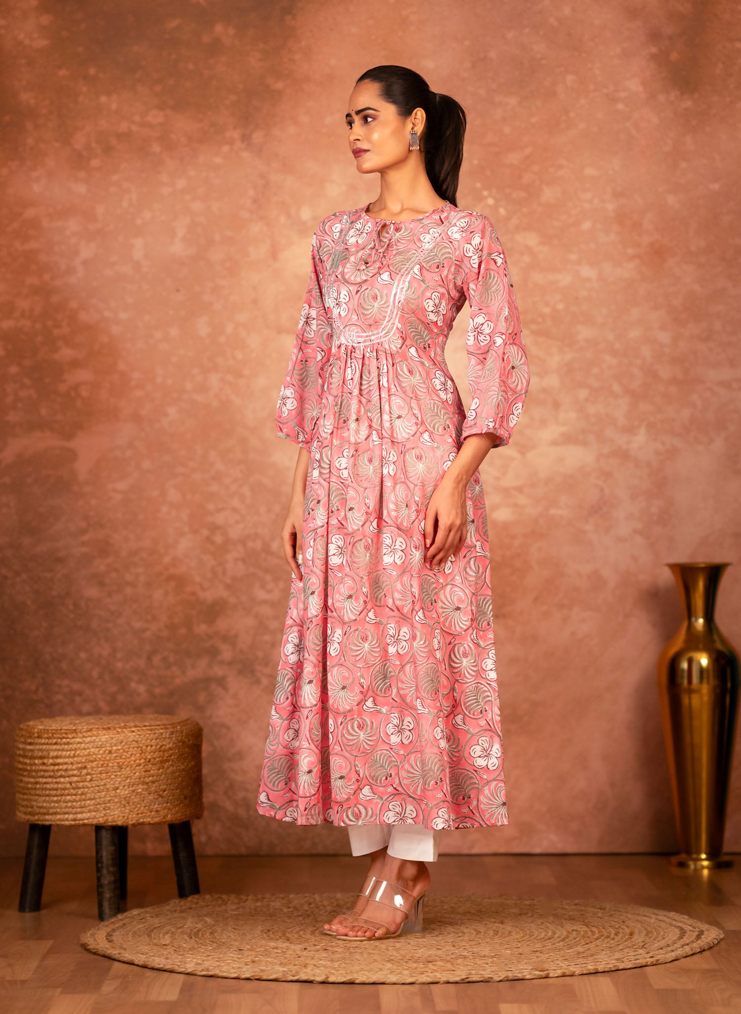 Add a touch of timeless elegance to your wardrobe with this pink floral hand block printed kurta set. Crafted from premium cotton fabric, this ensemble showcases exquisite hand block prints in soothing hues, reflecting traditional craftsmanship with a modern appeal. The kurta features a round neckline, 3/4th sleeves, and a gathered waist, offering a flattering silhouette for all body types.